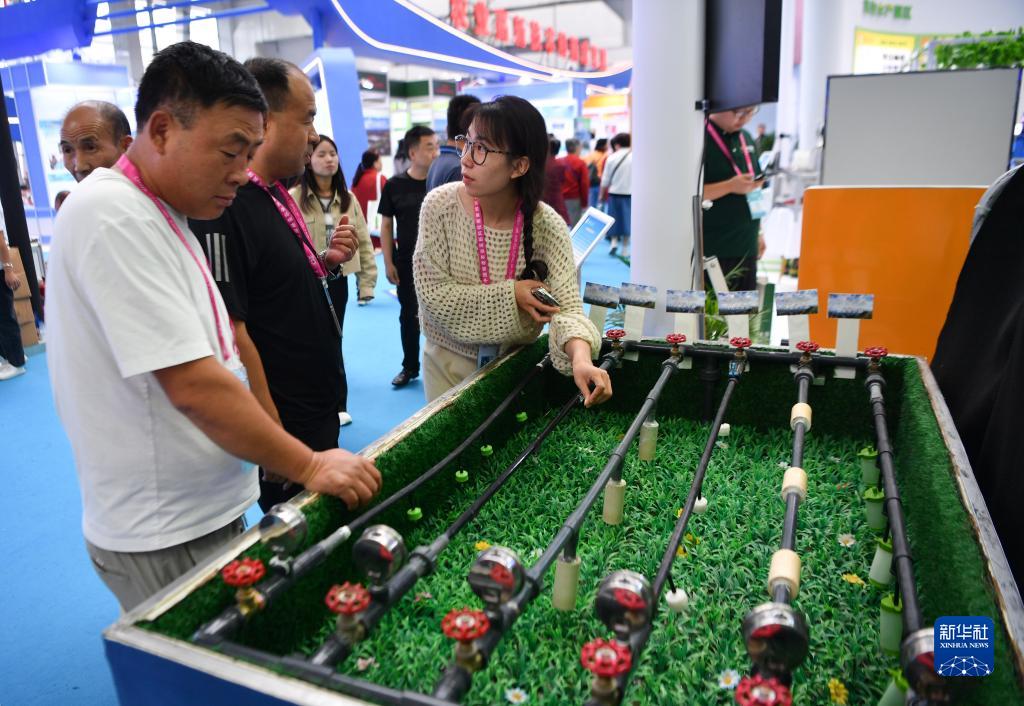9月21日,工作人員(右一)向參觀(guān)者介紹一款節水灌溉設備。