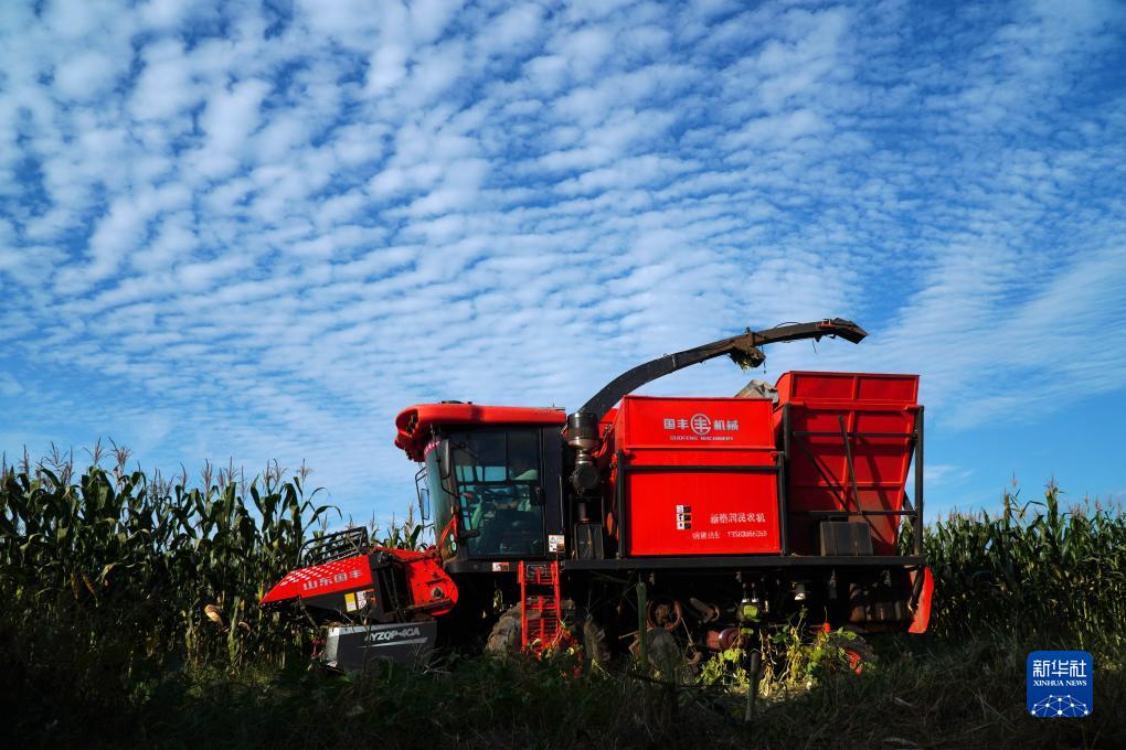 9月20日,在山東省新泰市禹村鎮,一臺玉米聯(lián)合收割機在收獲成熟的玉米。