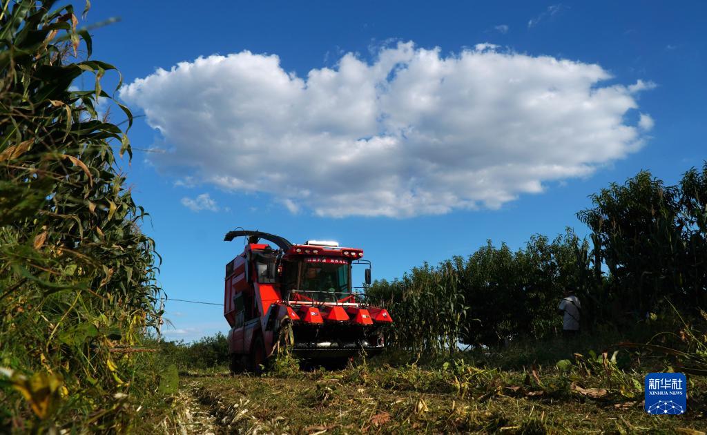 9月20日,在山東省新泰市禹村鎮,一臺玉米聯(lián)合收割機在玉米地里行駛。