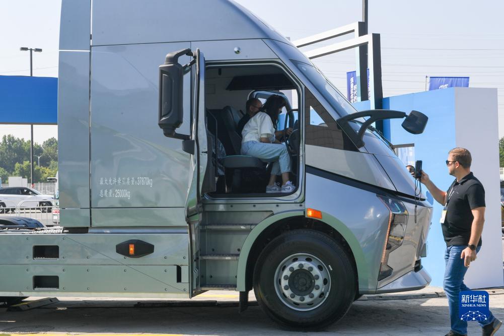 9月21日,在2023世界智能網(wǎng)聯(lián)汽車(chē)大會(huì )室外展區,幾位國外參觀(guān)者在參觀(guān)一輛新能源重卡。