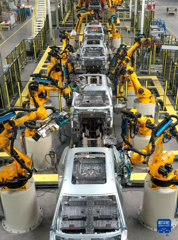 9月21日,在山東省青島市即墨區一家汽車(chē)制造企業(yè)的焊裝車(chē)間,機器人在進(jìn)行焊接作業(yè)(無(wú)人機照片)。新華社發(fā)(梁孝鵬 攝)