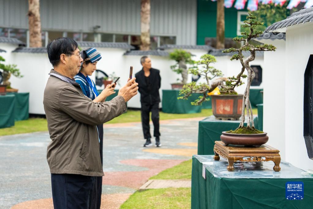 9月22日,在湘潭盤(pán)龍大觀(guān)園,觀(guān)眾在給展出的盆景拍照。