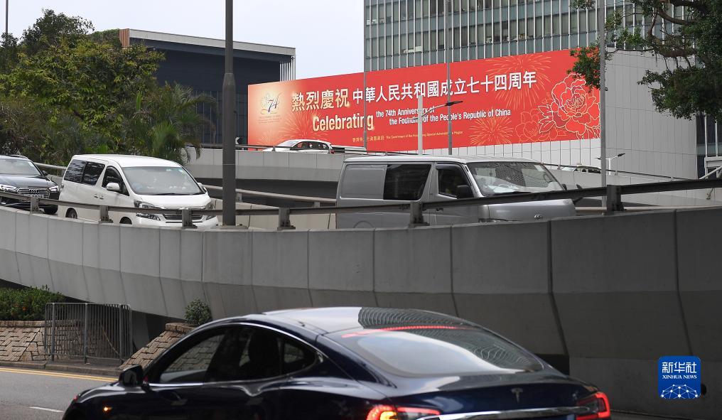 國慶節將至,香港街頭張貼國慶海報,慶祝中華人民共和國成立74周年。