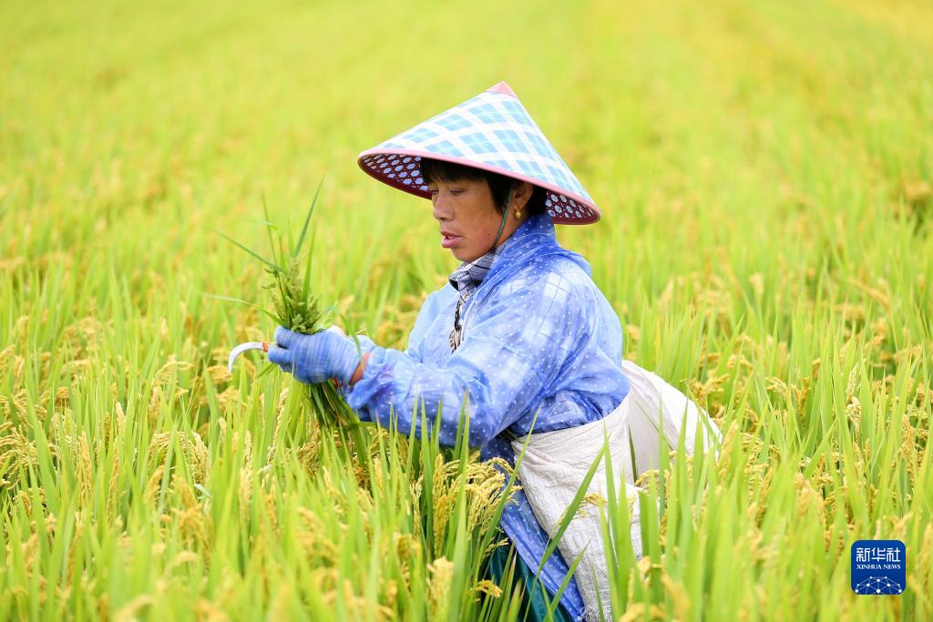 9月23日,江蘇省淮安市洪澤區岔河鎮東陳村村民在有機水稻田去除雜草。