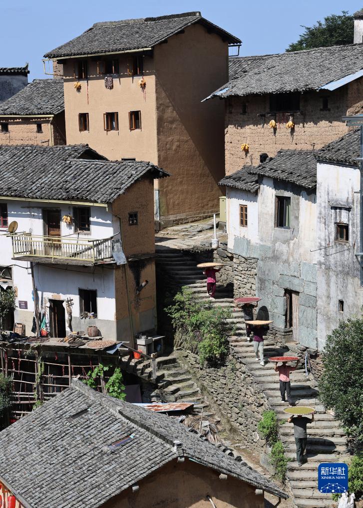 9月18日,在黃山市歙縣陽(yáng)產(chǎn)村,村民頭頂曬匾走在村里,準備晾曬農作物。