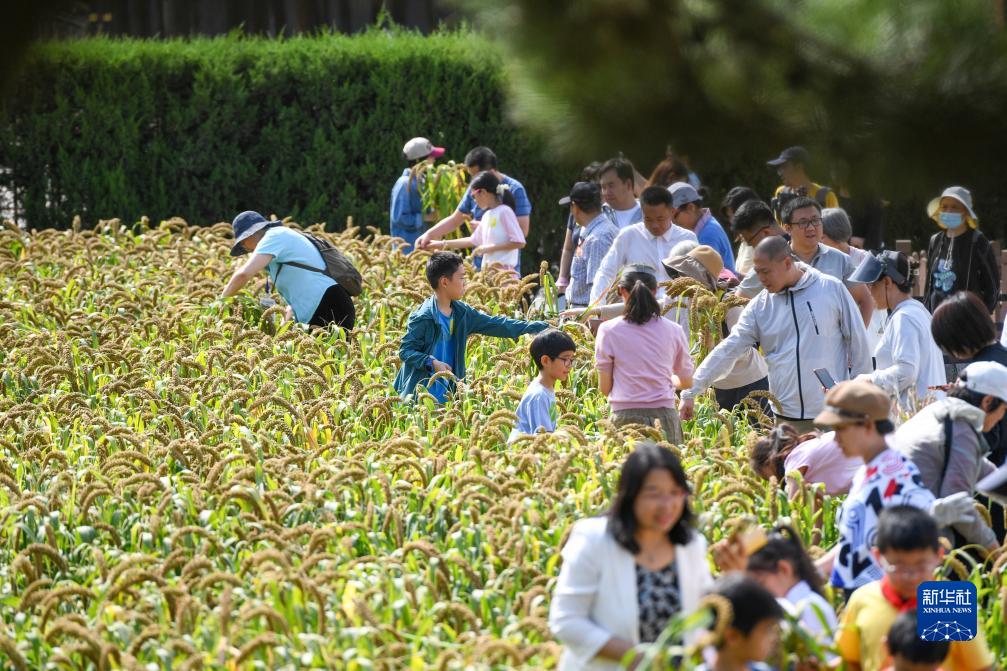 9月23日,農耕體驗季活動(dòng)參與者在收割北京先農壇耤田內種植的稷。