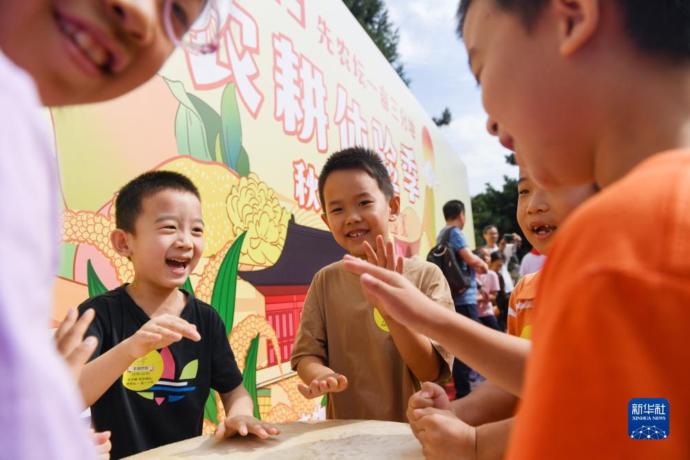 9月23日,小朋友在農耕體驗季活動(dòng)上敲響“豐收鼓”。