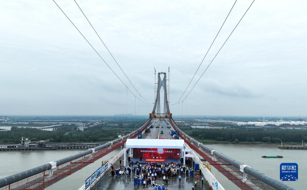 9月23日拍攝的南京仙新路過(guò)江通道跨江大橋合龍儀式現場(chǎng)(無(wú)人機照片)。