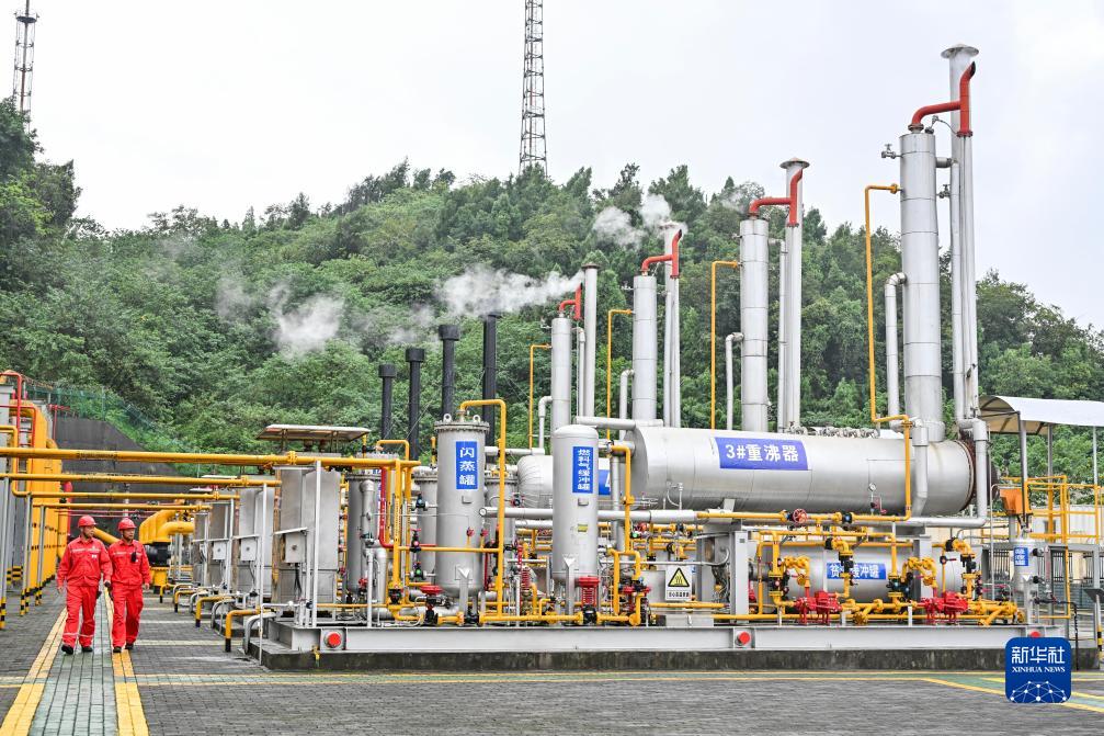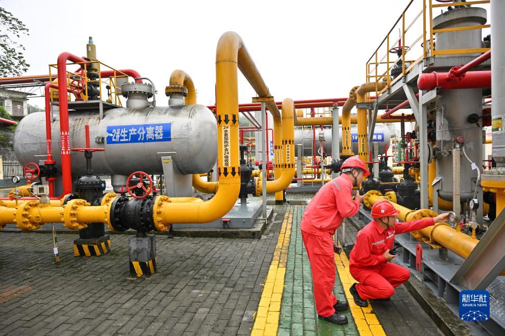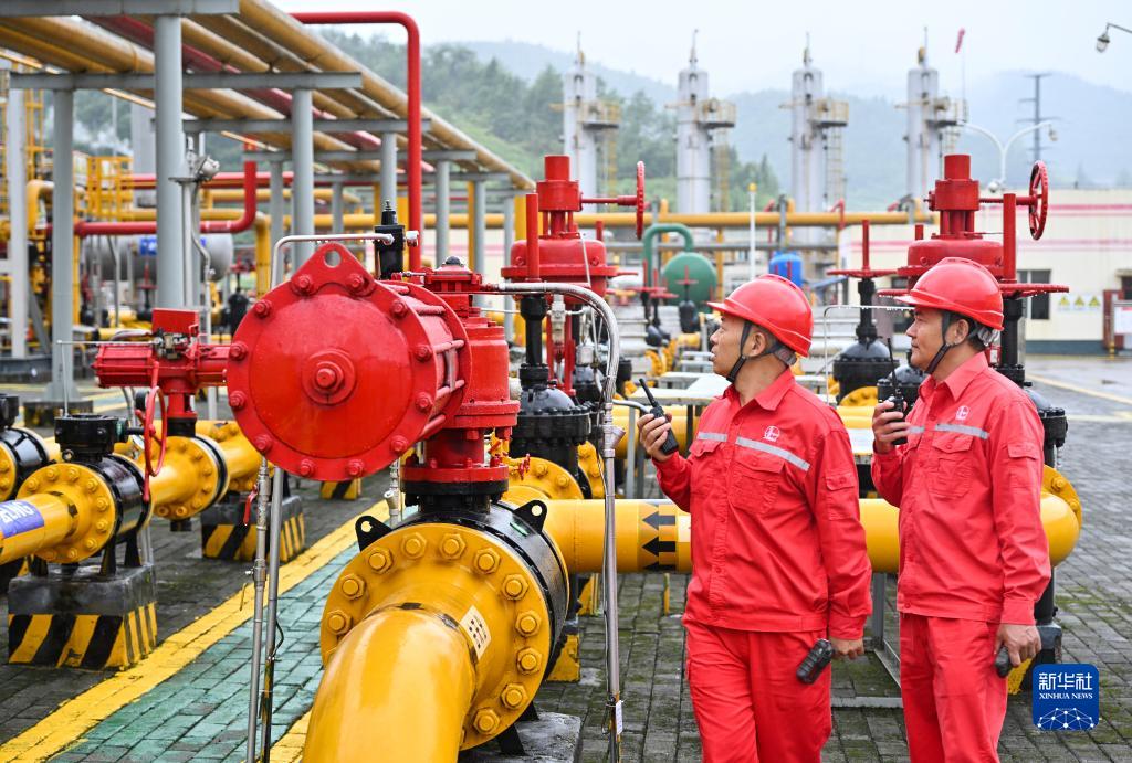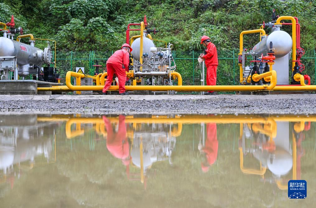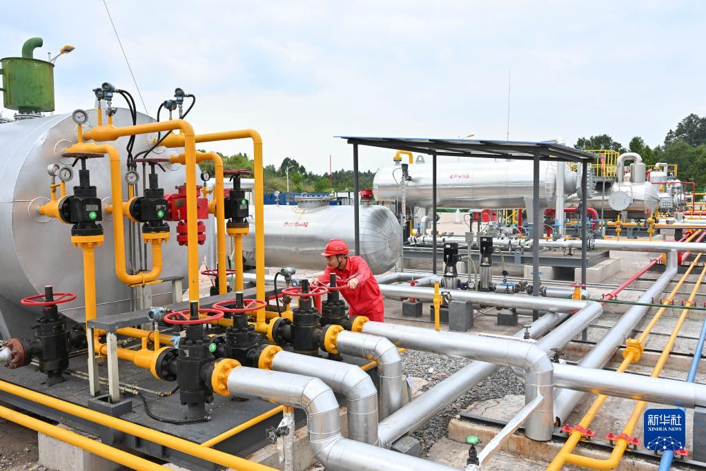 技術(shù)人員在位于重慶涪陵的涪陵頁(yè)巖氣田白濤集輸站對設備進(jìn)行巡檢(9月21日攝)。