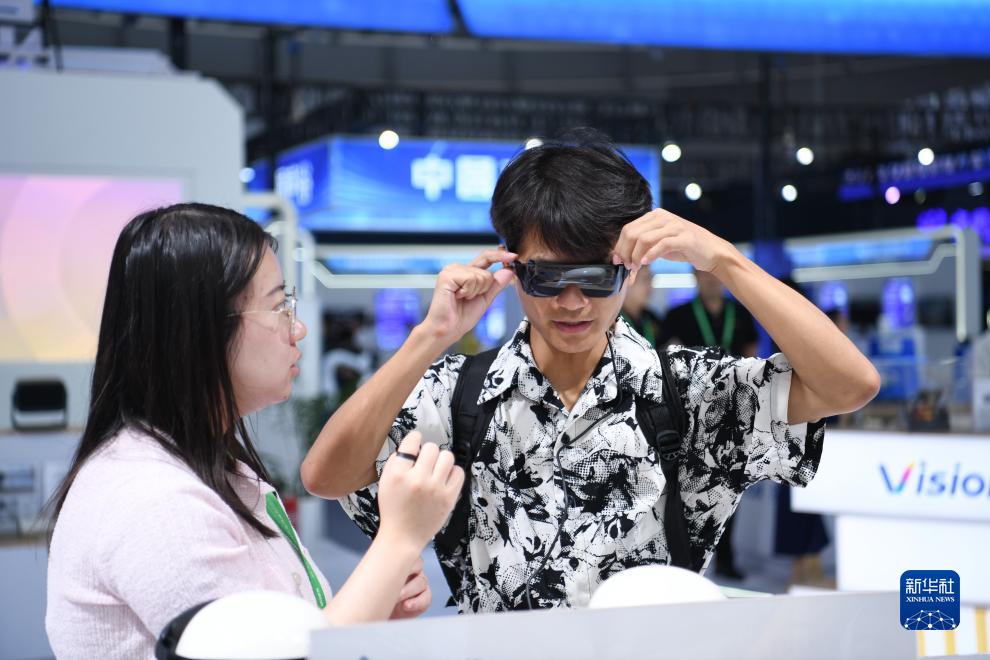 9月20日,觀(guān)眾在2023世界制造業(yè)大會(huì )集成電路與新型顯示展區體驗一款智能觀(guān)影眼鏡。