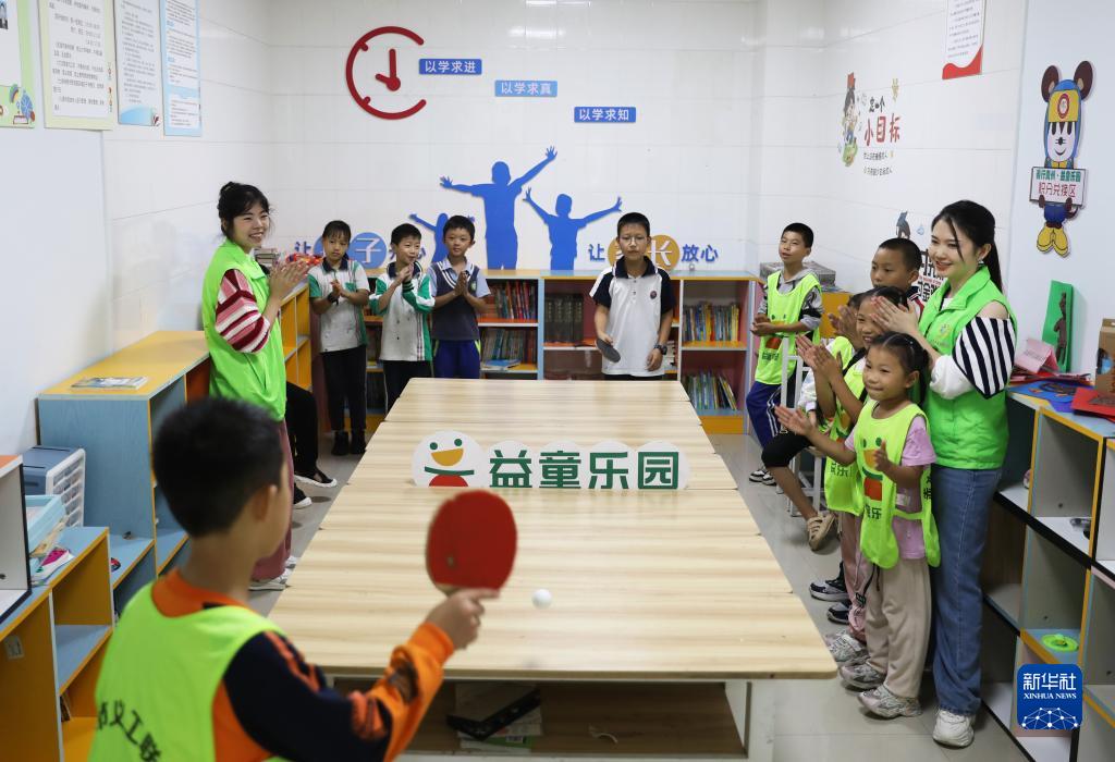 9月23日,在赤水市市中街道濱西社區益童樂(lè )園,孩子們在“童伴媽媽”陪伴下打乒乓球。