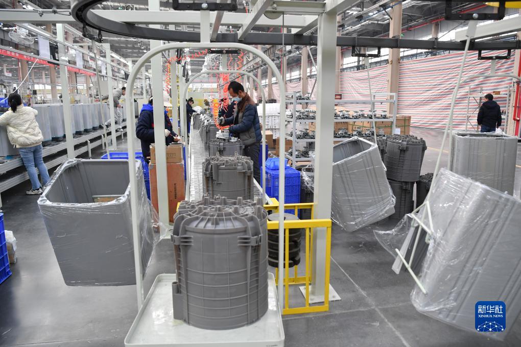 在西安國際港站附近的一家家電生產(chǎn)企業(yè)內,工人在生產(chǎn)線(xiàn)上組裝洗衣機(2月22日攝)。