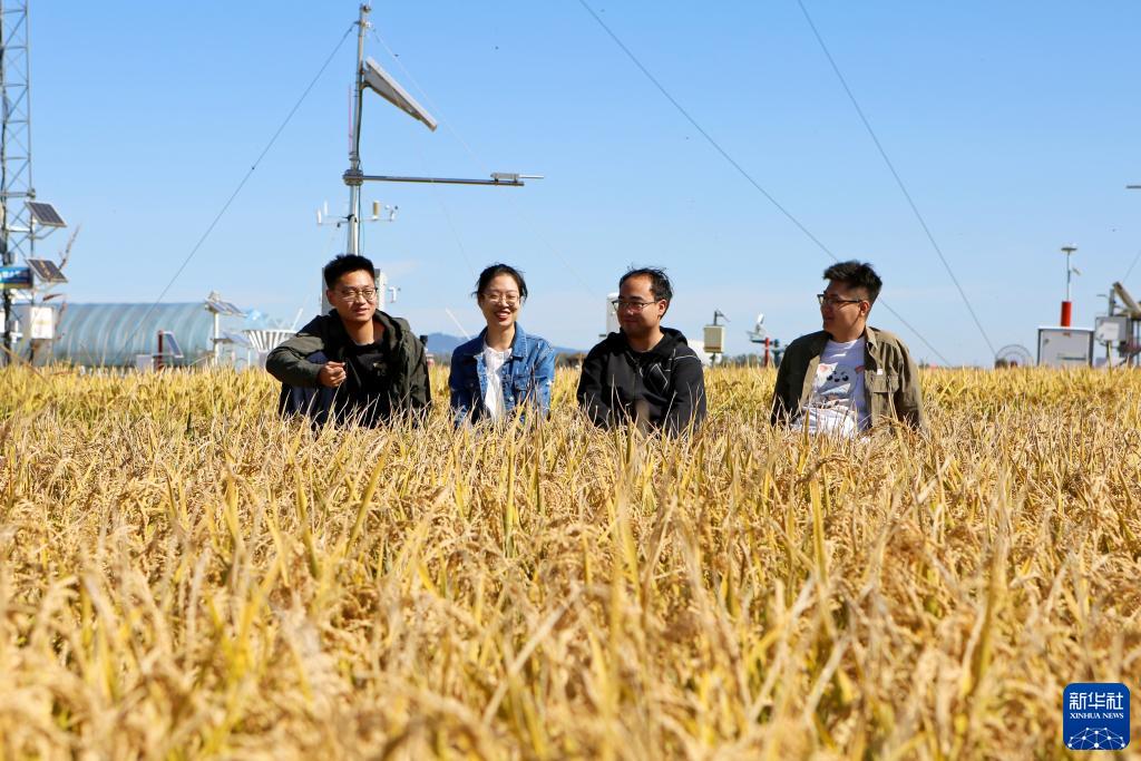 在富錦市現代農業(yè)萬(wàn)畝水稻科技示范園實(shí)驗基地,四名青年氣象員在工閑時(shí)休息聊天(9月23日攝)。