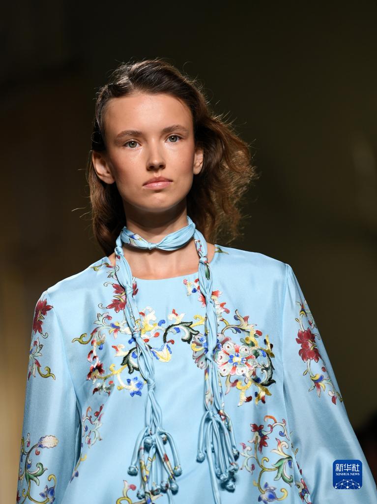 9月24日,模特在意大利米蘭時(shí)裝周上展示含有貴州苗繡元素的設計時(shí)裝。
