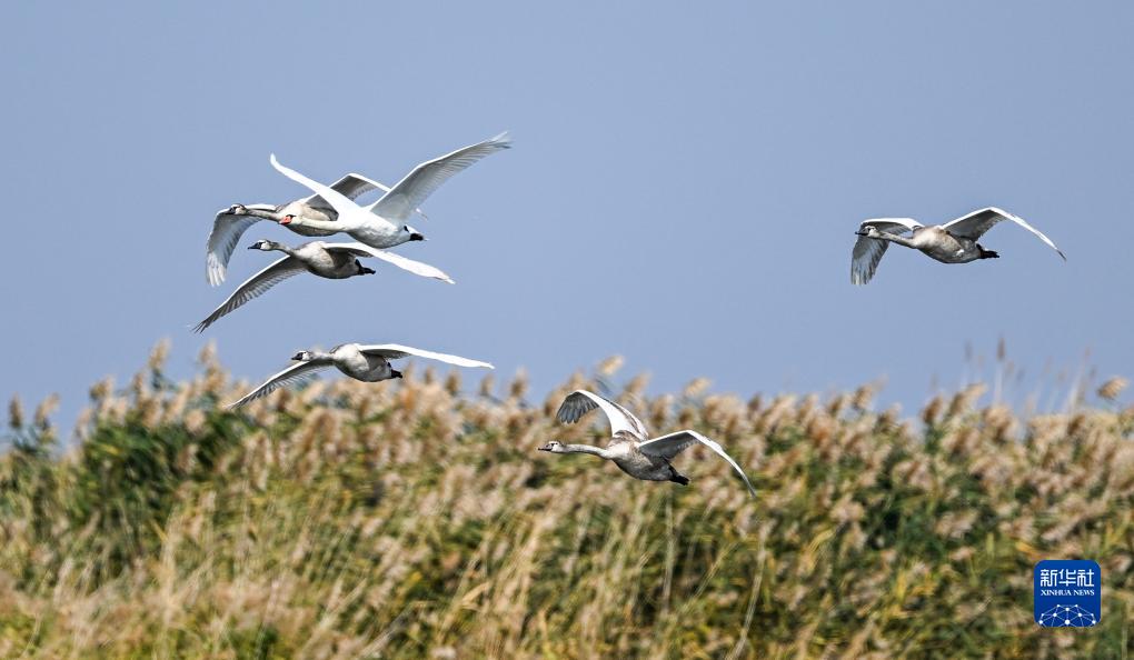 烏梁素海,意為“紅柳湖”,位于黃河“幾字彎”頂部,是黃河流域最大的湖泊濕地。近年來(lái),隨著(zhù)烏梁素海生態(tài)治理力度不斷加大,生態(tài)成果也不斷顯現。各類(lèi)候鳥(niǎo)在這里安了家,本來(lái)前往西伯利亞的疣鼻天鵝也在烏梁素海產(chǎn)卵孵化生活,烏梁素海成為我國最大的疣鼻天鵝繁殖基地。近日,在烏梁素海湖面上,成年疣鼻天鵝帶領(lǐng)幼鳥(niǎo)練習飛翔,準備為過(guò)冬前的長(cháng)途遷徙做準備。