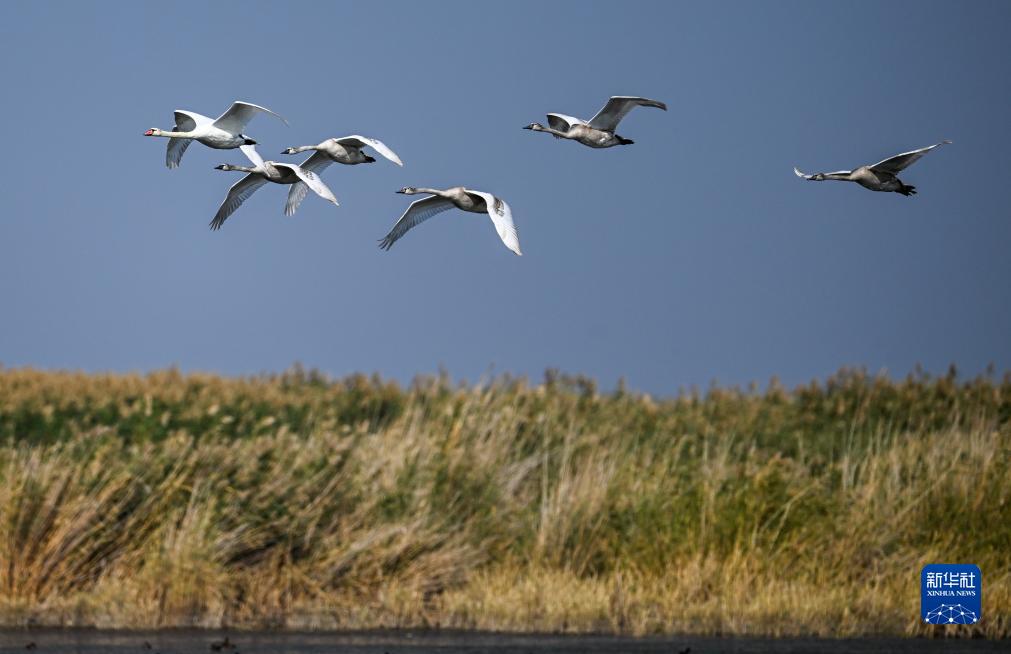烏梁素海,意為“紅柳湖”,位于黃河“幾字彎”頂部,是黃河流域最大的湖泊濕地。近年來(lái),隨著(zhù)烏梁素海生態(tài)治理力度不斷加大,生態(tài)成果也不斷顯現。各類(lèi)候鳥(niǎo)在這里安了家,本來(lái)前往西伯利亞的疣鼻天鵝也在烏梁素海產(chǎn)卵孵化生活,烏梁素海成為我國最大的疣鼻天鵝繁殖基地。近日,在烏梁素海湖面上,成年疣鼻天鵝帶領(lǐng)幼鳥(niǎo)練習飛翔,準備為過(guò)冬前的長(cháng)途遷徙做準備。
