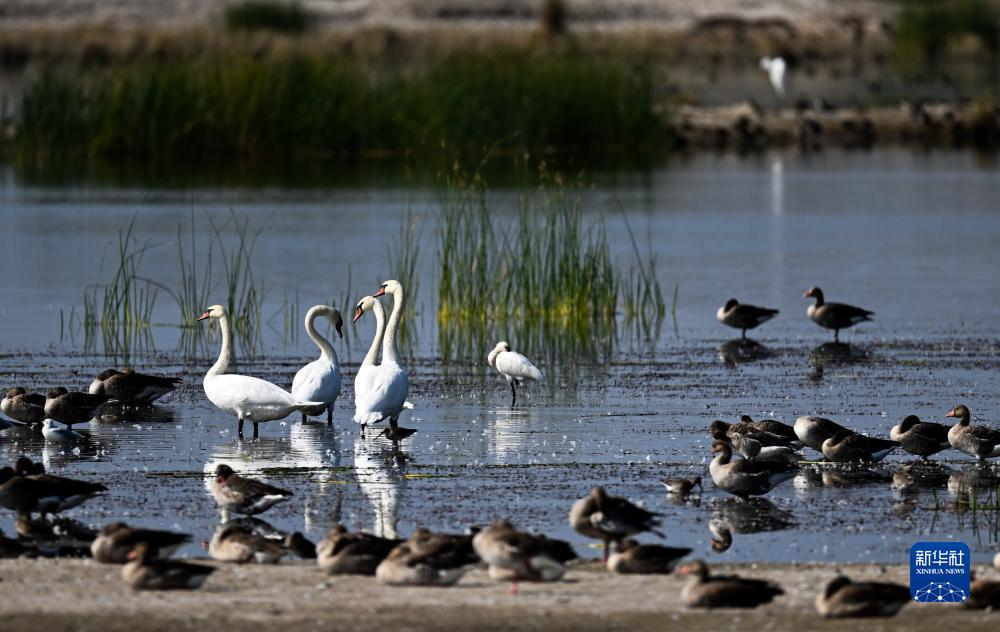 烏梁素海,意為“紅柳湖”,位于黃河“幾字彎”頂部,是黃河流域最大的湖泊濕地。近年來(lái),隨著(zhù)烏梁素海生態(tài)治理力度不斷加大,生態(tài)成果也不斷顯現。各類(lèi)候鳥(niǎo)在這里安了家,本來(lái)前往西伯利亞的疣鼻天鵝也在烏梁素海產(chǎn)卵孵化生活,烏梁素海成為我國最大的疣鼻天鵝繁殖基地。近日,在烏梁素海湖面上,成年疣鼻天鵝帶領(lǐng)幼鳥(niǎo)練習飛翔,準備為過(guò)冬前的長(cháng)途遷徙做準備。