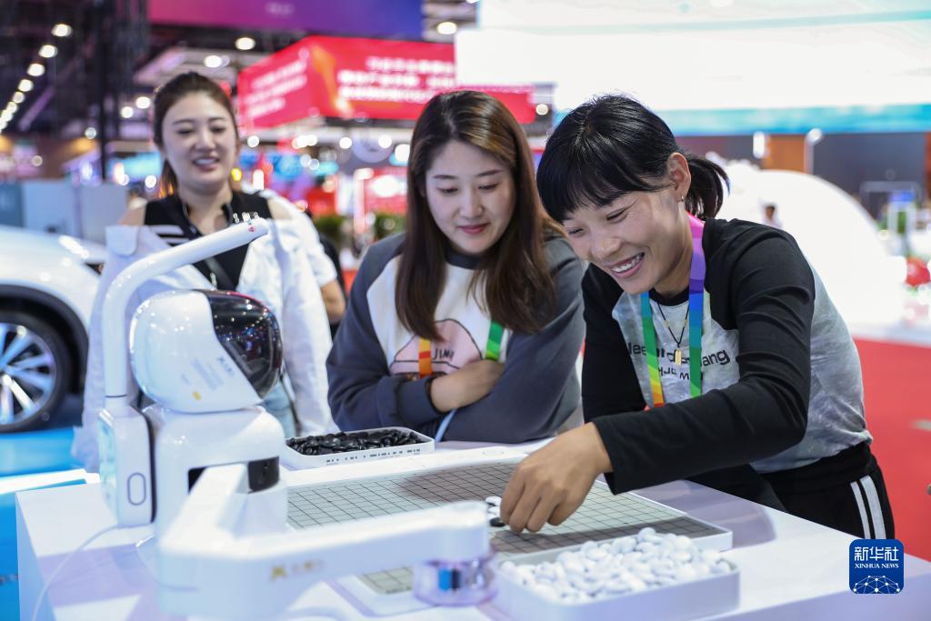 9月25日,工作人員在“數字賦能 智造未來(lái)”主題展覽上與機器人對弈。