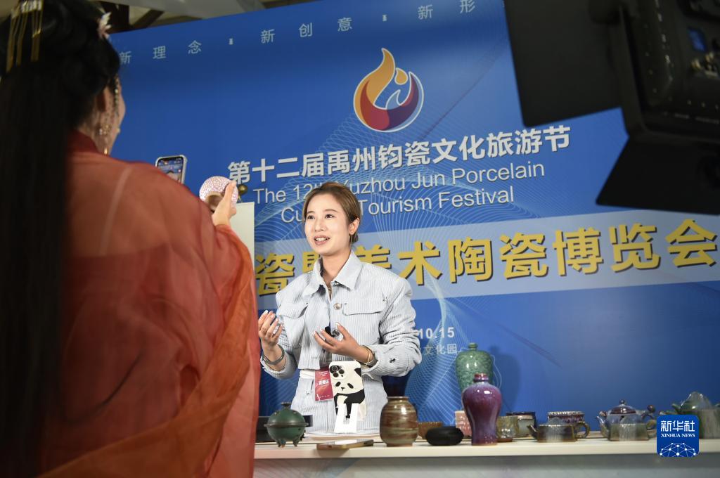 9月25日,工作人員在禹州市神垕鈞瓷工業(yè)文化園內舉辦的中國鈞瓷暨美術(shù)陶瓷博覽會(huì )現場(chǎng)進(jìn)行直播,推介鈞瓷產(chǎn)品。