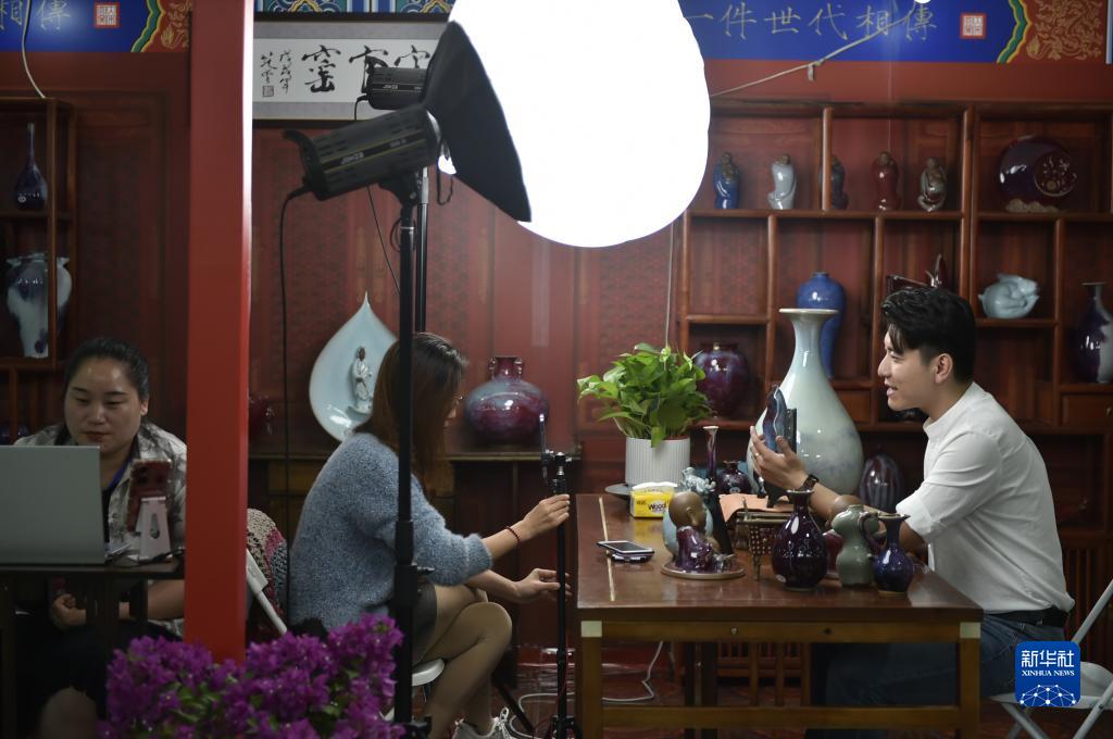 9月25日,工作人員在禹州市神垕鈞瓷工業(yè)文化園內舉辦的中國鈞瓷暨美術(shù)陶瓷博覽會(huì )現場(chǎng)進(jìn)行直播,推介鈞瓷產(chǎn)品。