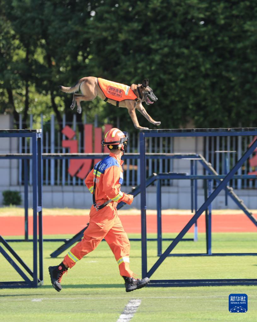 9月25日,在2023年福建省消防行業(yè)職業(yè)技能競賽現場(chǎng),消防員參加“搜救犬救援”項目的比拼。
