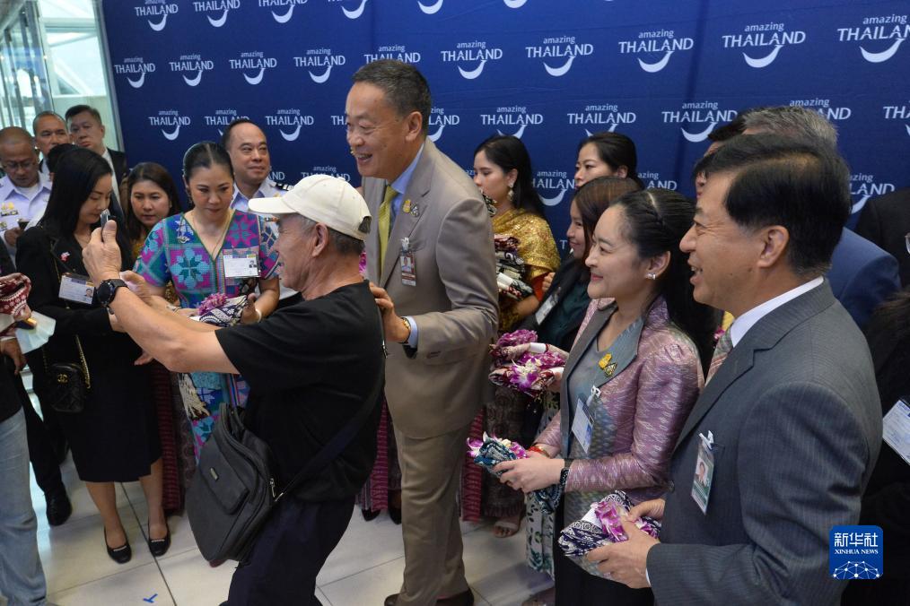 9月25日,泰國總理賽塔·他威信(中)在曼谷素萬(wàn)那普國際機場(chǎng)迎接中國游客。