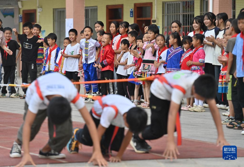 9月26日,在梧州市長(cháng)洲區古道小學(xué),學(xué)生們在大課間觀(guān)看“大象拔河”。