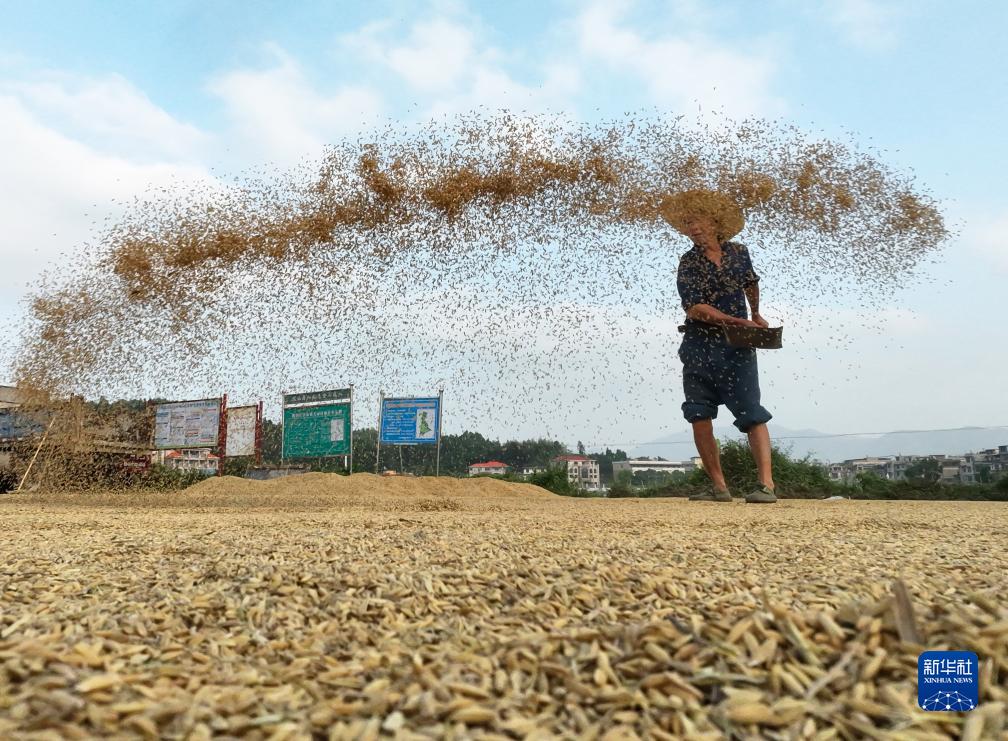 9月25日,湖南省衡陽(yáng)市衡陽(yáng)縣關(guān)市鎮的農民在晾曬稻谷。
