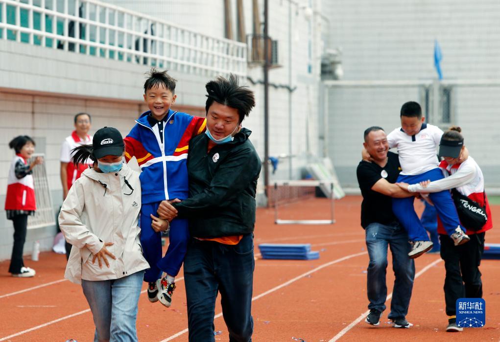 9月26日,小學(xué)生和家長(cháng)在進(jìn)行抬轎子親子游戲比賽。