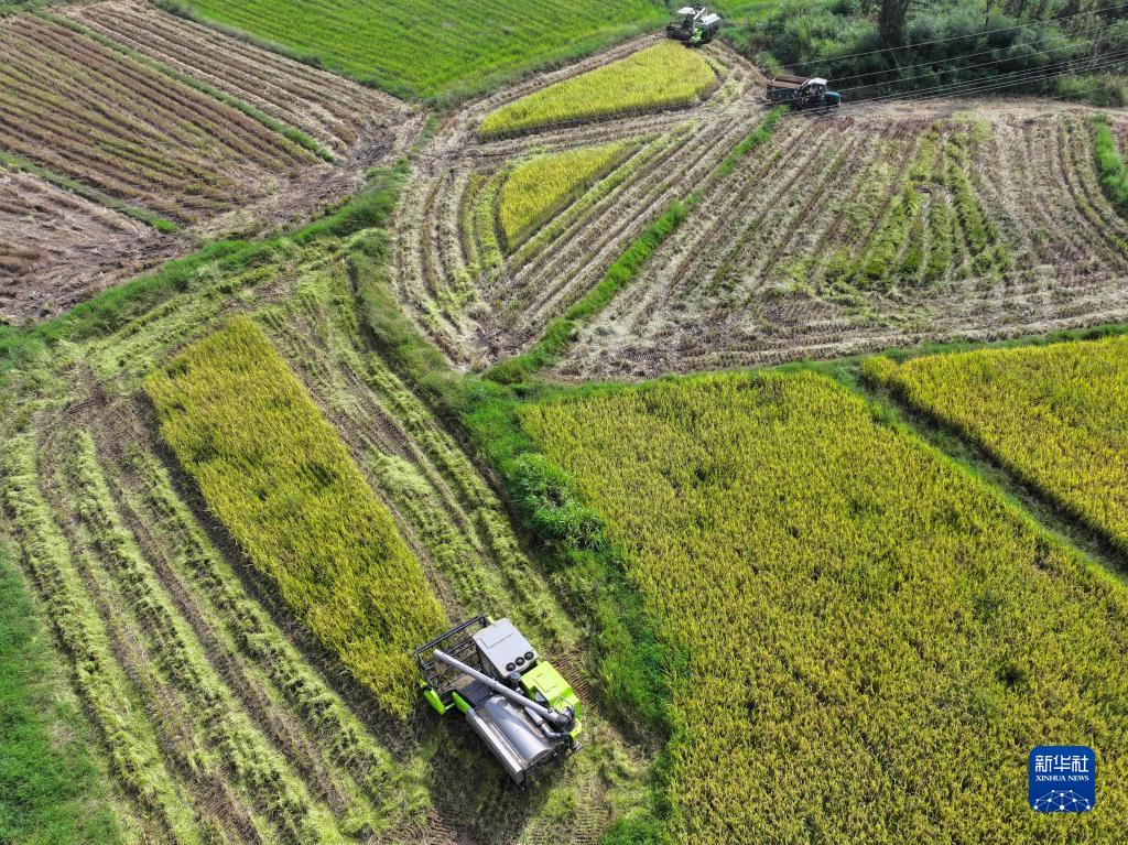 金秋時(shí)節,湖南省瀏陽(yáng)市沿溪鎮種植的中稻迎來(lái)收獲季,當地農民搶抓農時(shí)收割水稻,稻田里一派繁忙景象。