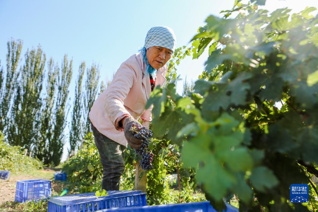 9月26日,在新疆吐魯番市鄯善縣,工人在采摘釀酒葡萄。