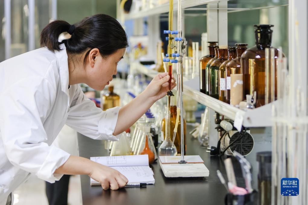 9月26日,在新疆吐魯番市鄯善縣樓蘭酒莊,葡萄酒檢驗員在分析化驗葡萄酒的常規理化指標。