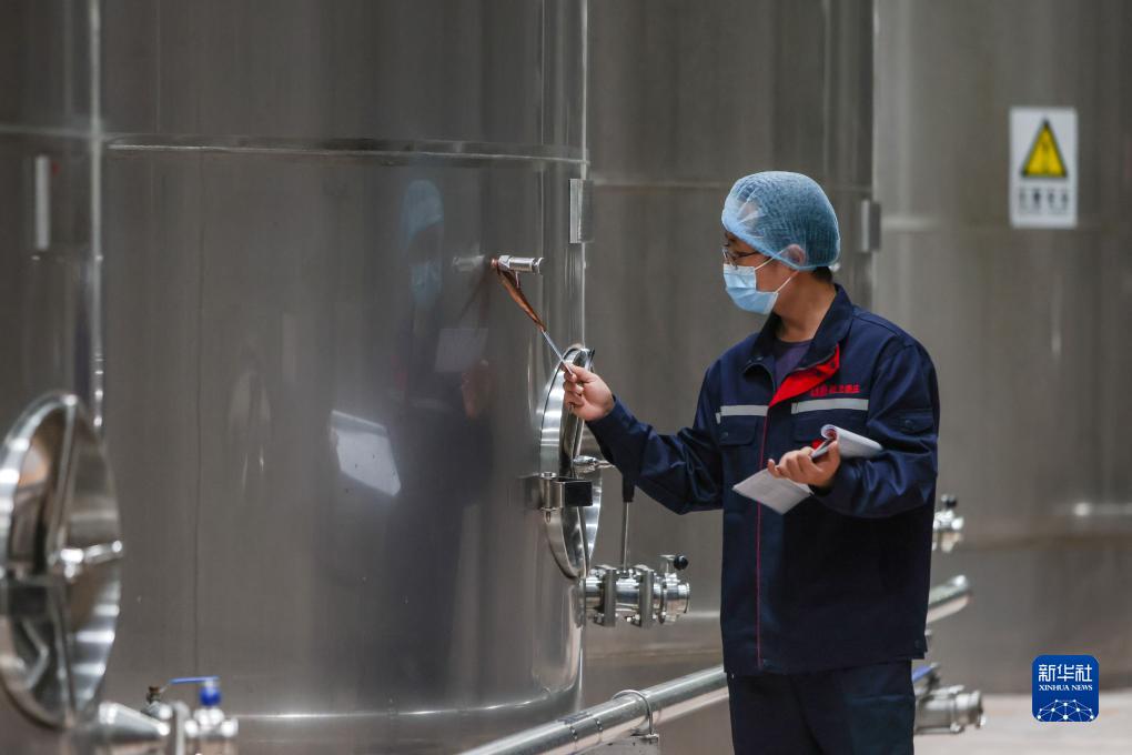 9月26日,在新疆吐魯番市鄯善縣樓蘭酒莊,釀造工在生產(chǎn)車(chē)間巡查。