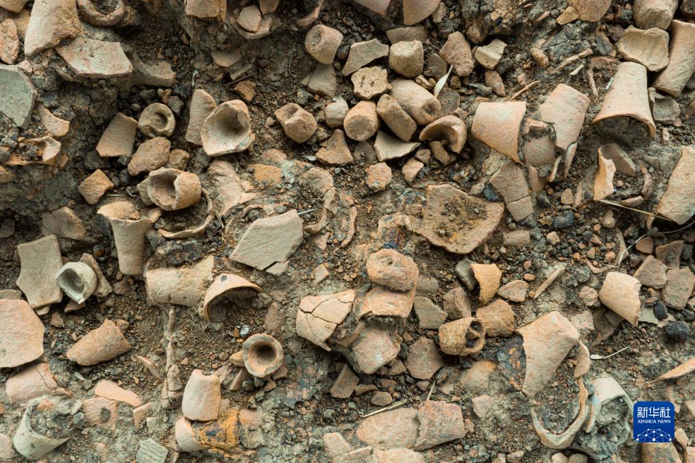 9月27日拍攝的石家河三房灣遺址出土的紅陶杯(無(wú)人機照片)。