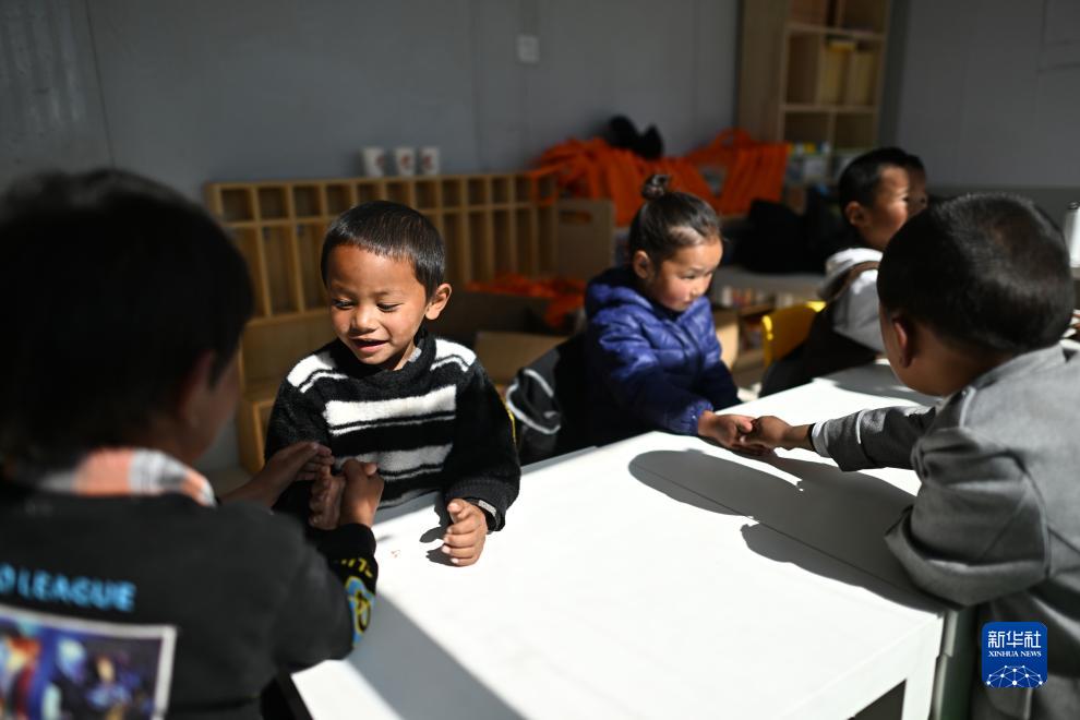 在青海省玉樹(shù)藏族自治州曲麻萊縣秋智鄉布甫村陽(yáng)光幼兒園,普松東周(左二)和伙伴們在教室內玩耍(9月14日攝)。