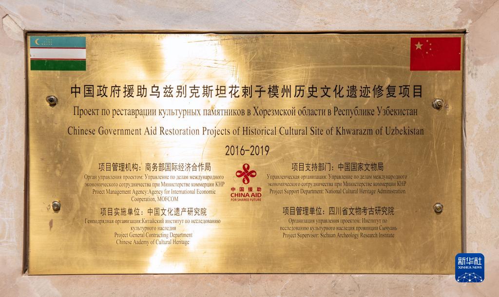 這是9月22日在烏茲別克斯坦花拉子模州的希瓦古城拍攝的“中國政府援助烏茲別克斯坦花剌子模州歷史文化遺跡修復項目”紀念牌。