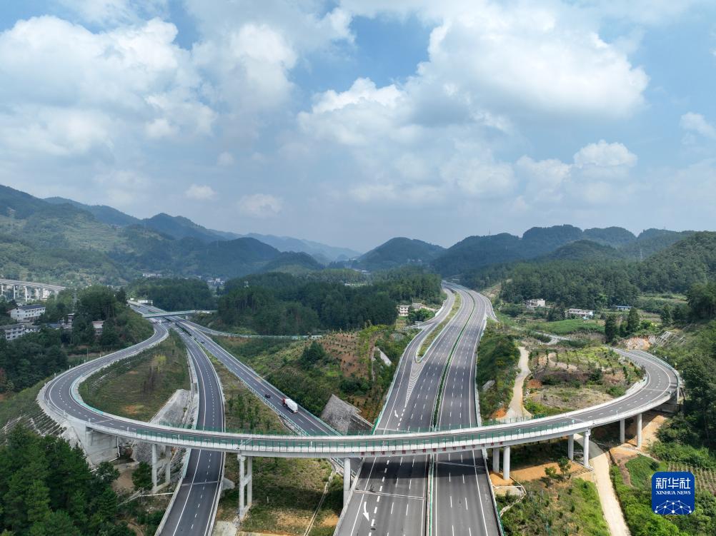 9月28日,在貴州省遵義市境內拍攝的蘭海高速重遵擴容工程新蒲樞紐互通(無(wú)人機全景照片)。