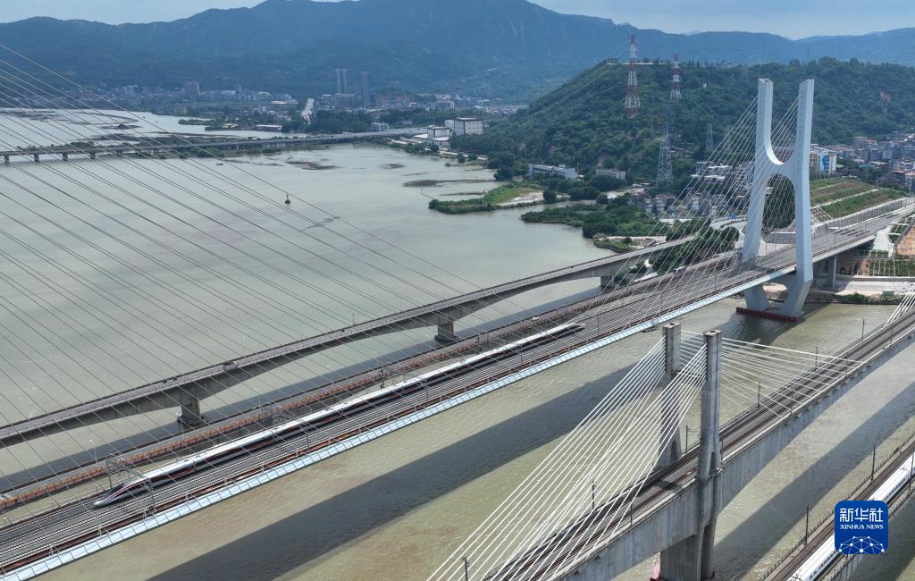 9月28日,復興號智能動(dòng)車(chē)組從福廈高鐵烏龍江大橋上駛過(guò)(無(wú)人機照片)。