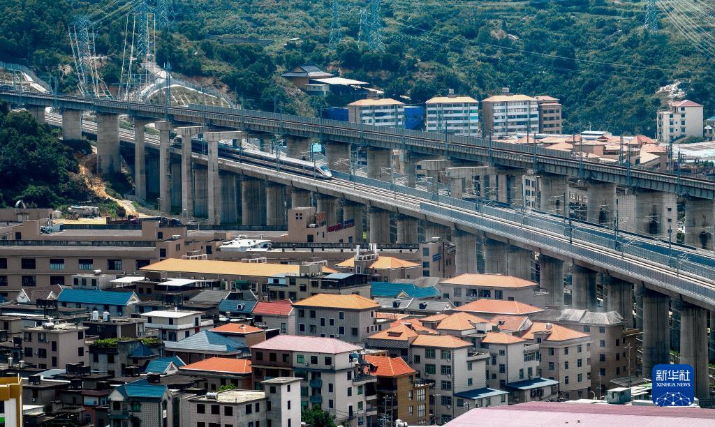 一列復興號智能配置動(dòng)車(chē)組駛出隧道,穿過(guò)居民區,準備駛過(guò)烏龍江大橋(9月13日攝 無(wú)人機照片)。