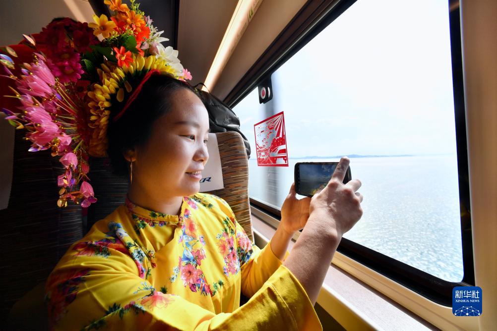 9月28日,在福廈高鐵首趟復興號智能動(dòng)車(chē)組G9801次列車(chē)上,泉州蟳埔女黃麗泳用手機拍攝窗外景色。
