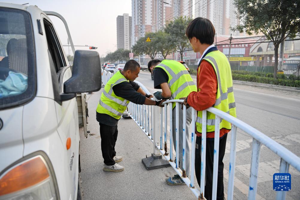 9月26日,在107國道河北保定涿州段,工人在安裝護欄。