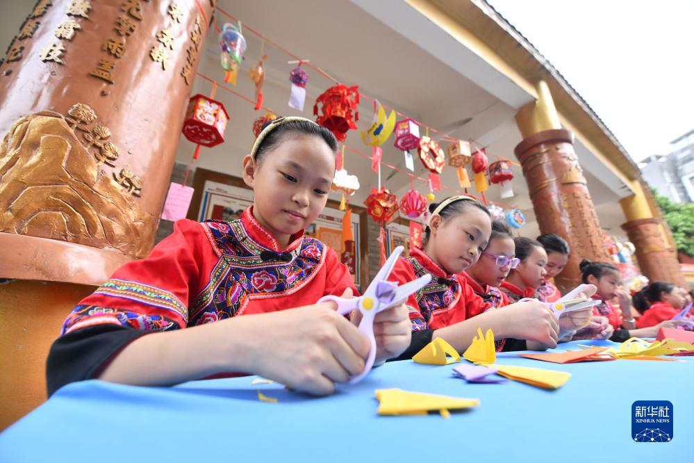 9月28日,梧州市龍圩區龍圩中心小學(xué)學(xué)生們在剪紙。