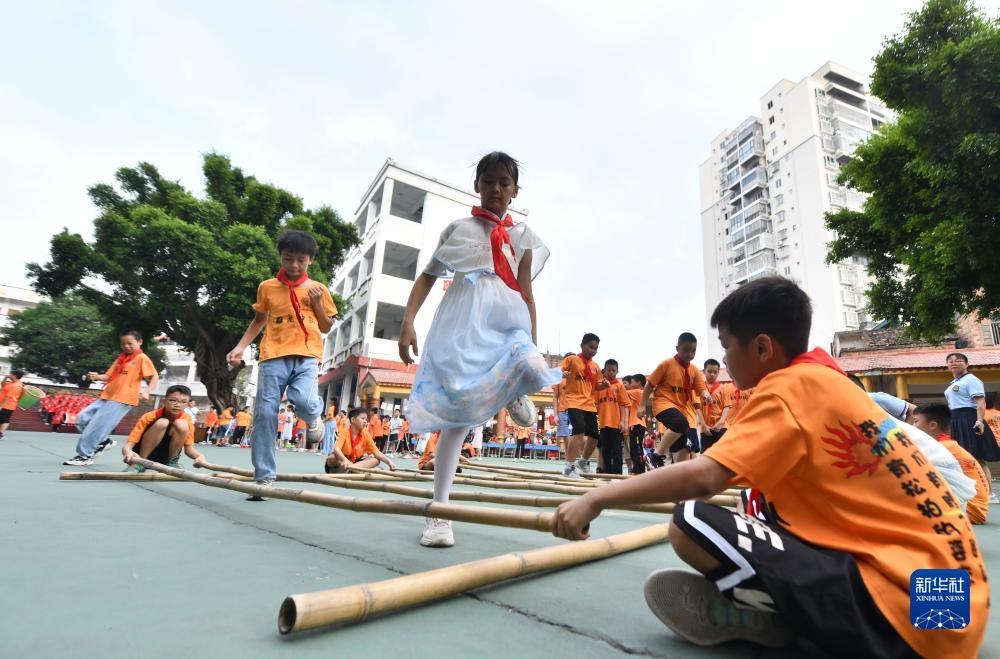 9月28日,在梧州市龍圩區龍圩中心小學(xué),學(xué)生們在跳竹竿舞。