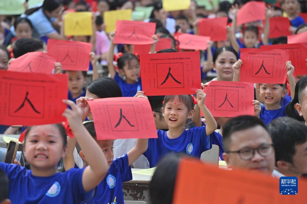 9月28日,梧州市龍圩區龍圩中心小學(xué)一年級新生在開(kāi)筆禮中用毛筆寫(xiě)下“人”字。