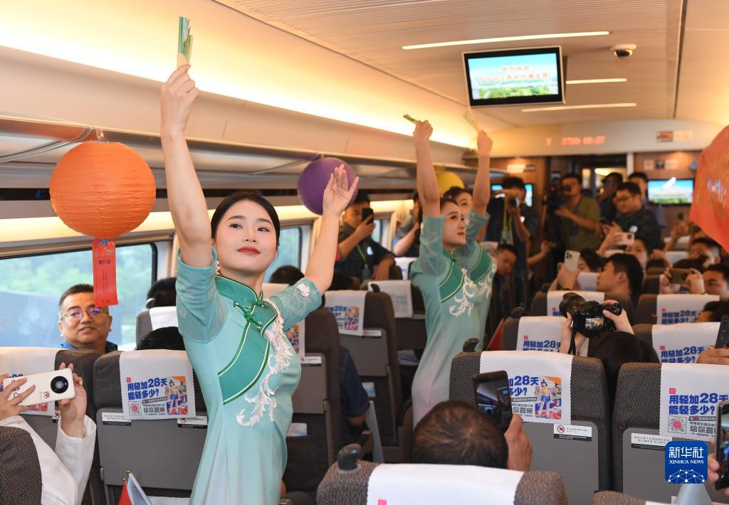 9月28日,南京客運段乘務(wù)員在首發(fā)G7799次列車(chē)上表演節目。