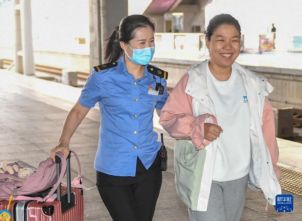 9月28日,長(cháng)春站“春之約”愛(ài)心服務(wù)室客運值班員馬叢(左)引導視障旅客上車(chē)。