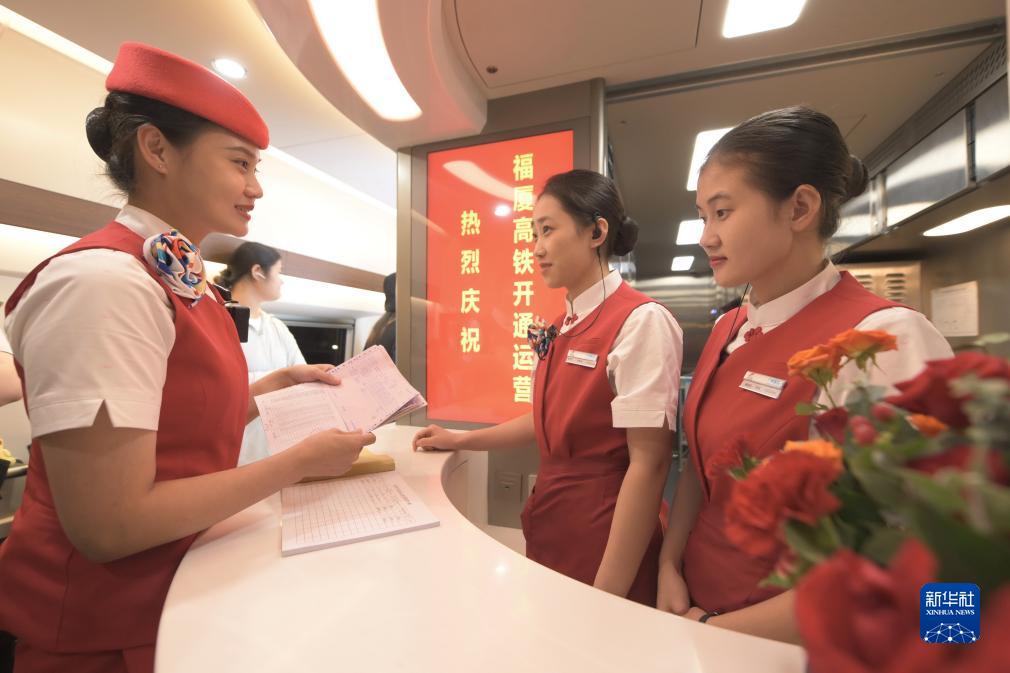 首發(fā)車(chē)G9801次列車(chē)長(cháng)車(chē)艷雪和她的同事登上福廈高鐵復興號智能動(dòng)車(chē)組為乘客服務(wù)?!霸诹熊?chē)上我們要用心用情做好服務(wù),讓乘坐福廈高鐵的乘客在旅行中享受到不一樣的跨海之旅,展現我們海上‘高姐’的風(fēng)采?!避?chē)艷雪說(shuō)。