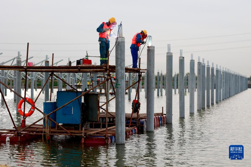 9月29日,工人在河北省唐山市豐南區黑沿子鎮“漁光一體”現代漁業(yè)產(chǎn)業(yè)園二期工程建設工地施工。