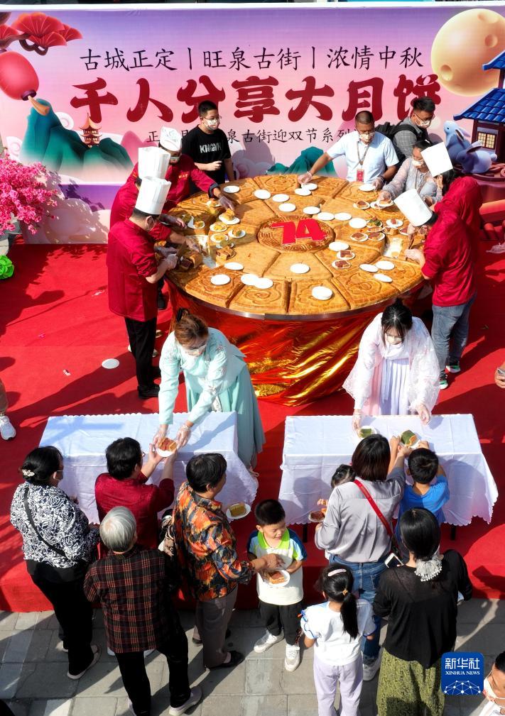 9月29日,游客在河北省石家莊市正定縣旺泉古街品嘗“大月餅”(無(wú)人機照片)。