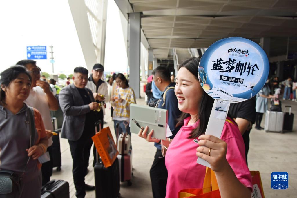 9月29日,一名導游在出發(fā)前向游客交代登船注意事項。